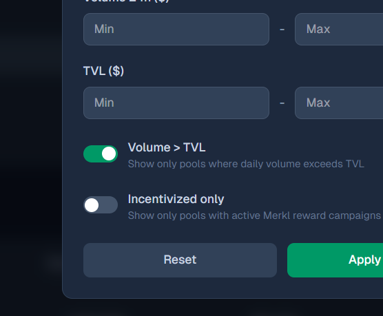 Discover the most profitable pools by filtering them with out TVL/VOL positive switch